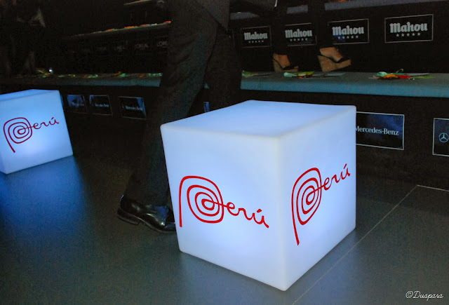 Momentos antes de comenzar los desfiles de las diseñadoras Peruanas, con la Marca Perú de fondo.
