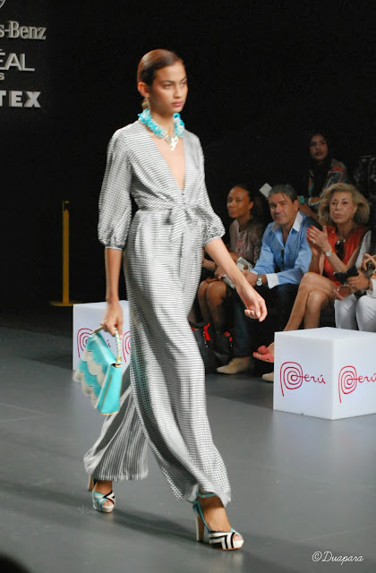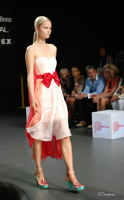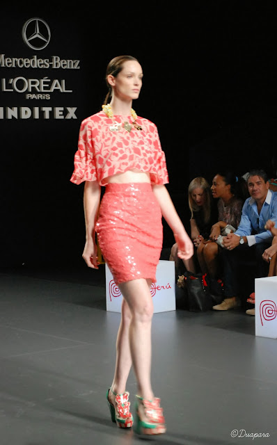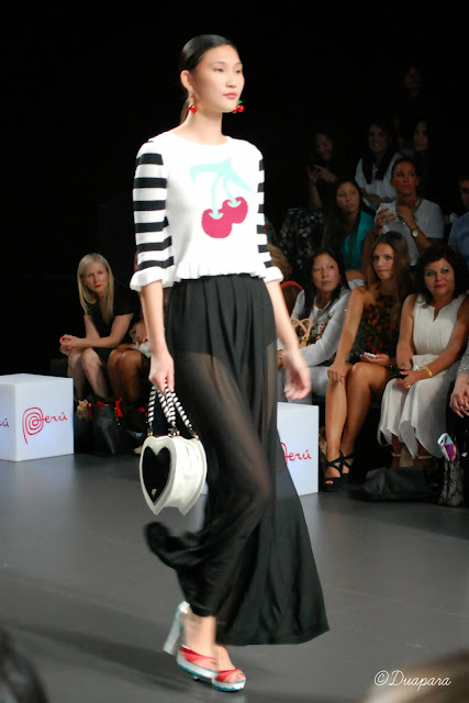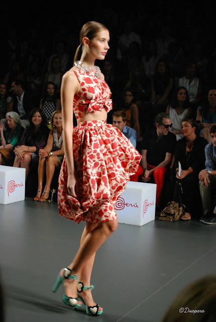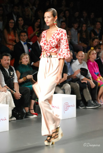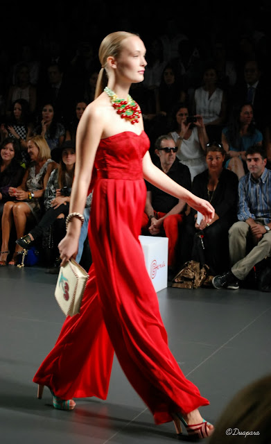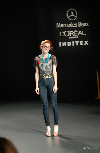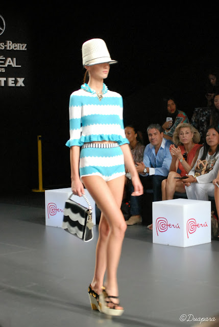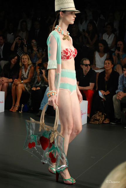 Los diseños de Jessica son preciosos, pero hay que fijarse en todos los detalles, desde los zapatos que son tan preciosos y parecieran muy cómodos, con corazones, lazos y mezcla de colores, todo muy vintage así como los pendientes, collares, bolsos y gorras, todo guardaba una uniformidad increíble, recalco que había una atmosfera Vintage en la pasarela en aquellos instantes.